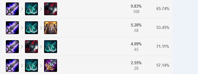 这三件可以说是剑魔的核心装,绿叉和破败的攻速可以极大的增强剑魔的输出和回复能力,黑切则在剑魔的高攻速之下能很快叠满层,并还能提供额外的移速!后续的三件小伙伴们可以根据局势自行选择,逆风局记得要补肉装!