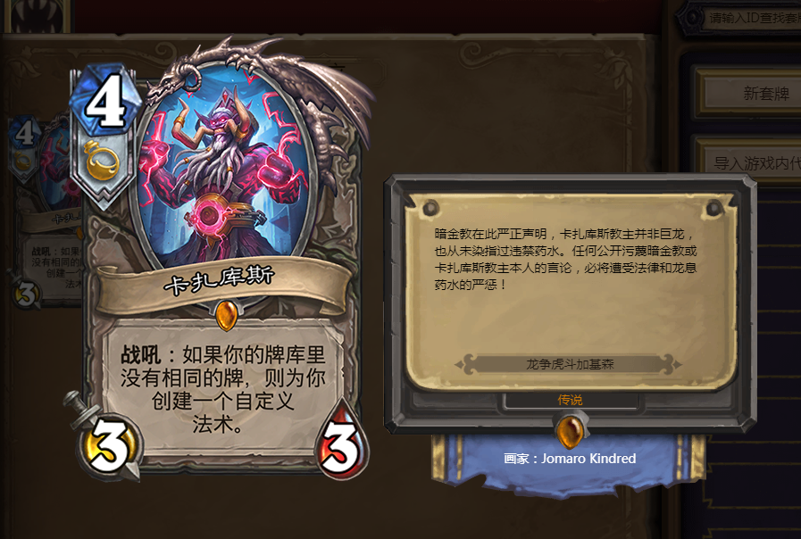 对阵慢速卡组时,我们就要想办法尽可能的骗掉对手一些非常棘手的解场法术,保证我们后期的机械combo不会被对手直接解掉而恩佐斯或者dk都能帮我们骗掉对手的这些牌,再不济我们也可以靠卡扎库斯帮我们找一两只8/8随从,也能非常有效的骗掉对手的解场法术。