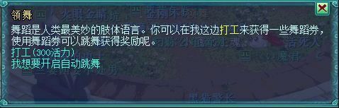 跳舞介绍:和“领舞”对话,玩家可以使用“舞蹈券”来跳舞,跳舞的同时会获得大量经验;