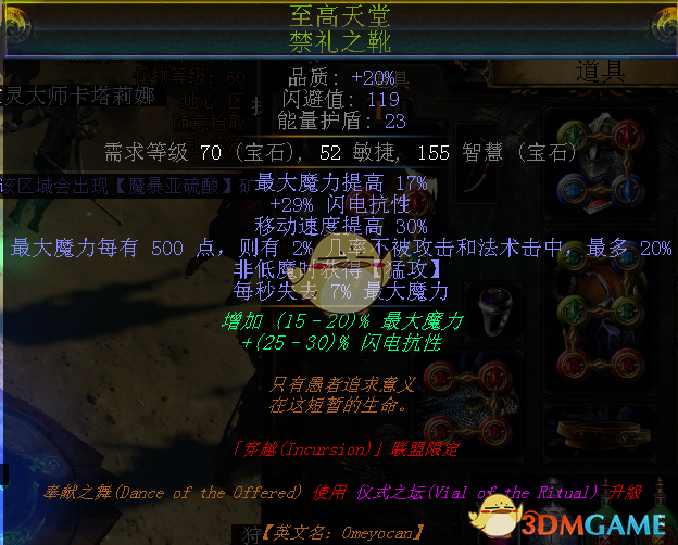 鞋子:至高天堂 7%魔力减少 技能 绝望20-诅咒光环20-范围增大20