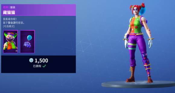 堡垒之夜10月31日商城,每周限时类皮肤刷新了男女的小丑套,“晚安安”,“藏猫猫”,还有鬼火南瓜套“空心头”。锹刷新了“收割者”,“雕刻师”,“吱吱镐”。每日限时的皮肤刷新了“暗月兔”,“杰克古尔冬”,“奇才”,“补丁巡逻者”。最后还刷了一个“戏法”表情。