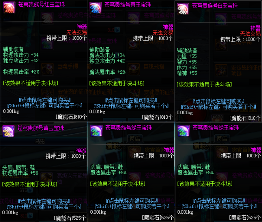 第二个就是安图恩商店中可以兑换的一些宝珠了,输出职业可以兑换的宝珠是加攻击力加暴击的宝珠,需要810个魔能石,三个浓缩的魔能石可以兑换10个魔能石,所以兑换左槽宝珠需要243个浓缩的魔能石。这个宝珠对于物理职业可能不是毕业宝珠,但是增加55点四维的宝珠,那对于奶爸奶妈绝对就是毕业宝珠了。还有加5%物理暴击和魔法暴击的宝珠,虽然也不是最强的,但是绝对是过度用极佳的宝珠,没有钱附魔的小伙伴可以用这些宝珠附魔哟。