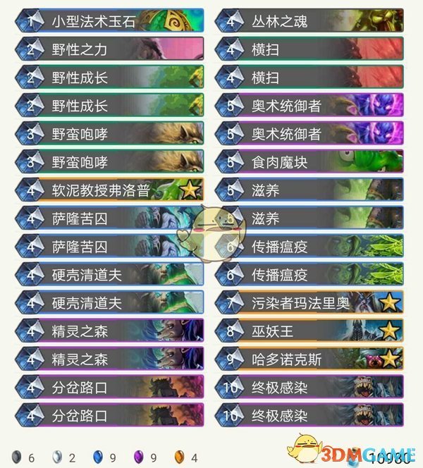 推荐理由:超生德的铺场来得快而迅猛,在对阵快攻时,可能前期会让一些节奏,导致场面丢失,但随着精灵之森加丛林之魂一波就能抢回来,开咆哮以小换大赚卡差,终极感染奠定胜局,打慢速同样不虚,不说亡语需要两拨的AOE才能清掉,超生德在中期的铺场是一波接着一波的,一断解就会被咆哮带走,最后还有大蜘蛛复活一波同样恶心。