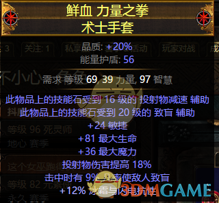 塑界黄手套:必须有致盲辅助(最好20级),推荐投射物减速(对投射物有加成),生命(80+),抗性,剩余属性敏捷、护盾、护甲等。致盲辅助同时会带一条9%-10%的击中致盲概率词缀,可以让其他部位的技能也能致盲,配合高hit的法术(天雷珠、烈焰风暴等)做到全程致盲,再配合耀阳徽记做到必中。