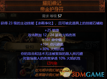 耀阳徽记。本bd核心装备,烈阳徽记的升级版,注意不要买错了,价格10c左右。项链的敏捷、攻击伤害、火焰穿透都是非常有价值的词缀。由于后期孔位空缺,比较推荐瓦出清晰、冰霜净化(打T18专用)的版本。