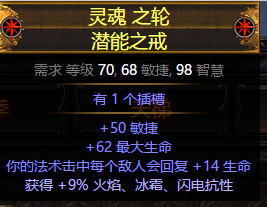 结魂之环。自残核心装备,每个召唤物死亡造成350物理伤害,配合召唤升华达到每次3个骷髅自伤528+,触发受伤释放。其他属性无要求。因为我选择了电甲,比较缺抗性,因此选择了瓦出加全抗的指环。市场产量非常大,价格便宜。
