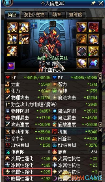 因为暴击率没有满,所以选择修炼怪物属性时增加了暴击率,并且命中率提高为100%,这两项是必须的,避免出现一个有暴击有命中,一个出现没有暴击和命中,测试的修炼怪物是105级的弗曼,这里我们只计算二觉的提升量。