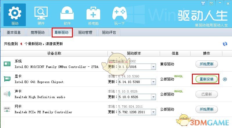 2)运行“驱动人生2012”点击“最新驱动”找到显卡的驱动点击开始更新。(如果系统已经安装显卡驱动,这里会显示“重新安装”)