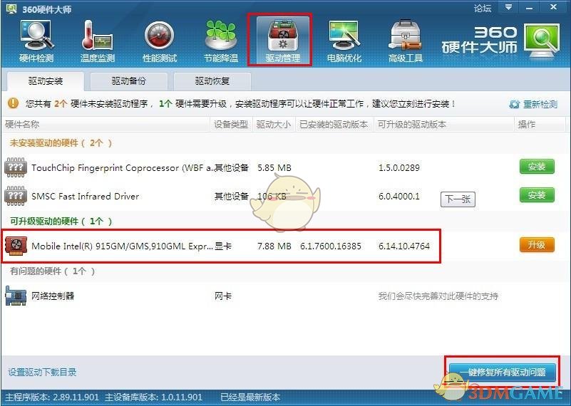 驱动管理-在驱动安装的选项里会将有问题的驱动列出来直接点击“一键修复所有驱动问题”