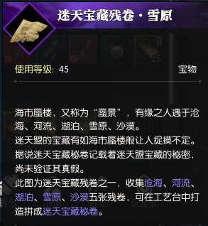 此图为迷天宝藏残卷之一,收集沧海、河流、湖泊、雪原、沙漠五张残卷,可在工艺台中打造拼成迷天宝藏秘卷。
