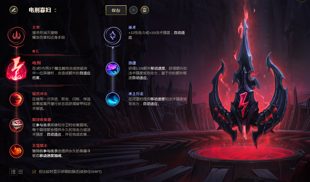 符文方面,寡妇当然是要带电刑了,电刑寡妇的伤害非常可观,爆发也很高。之后会点出猛然冲击,寡妇的被动隐身可以触发猛然冲击,眼球、无情猎手都非常适合寡妇。副系点出巫术系,之后可以点出迅捷和水上行走,最大化寡妇的游走能力。