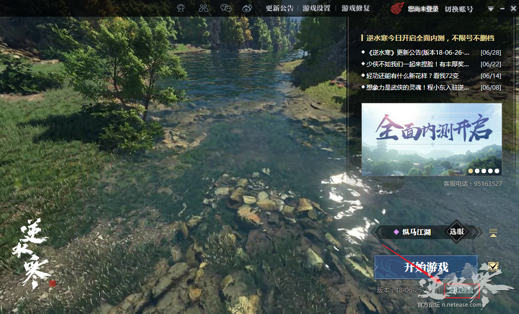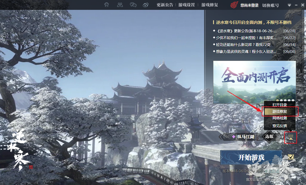 您可以在逆水寒启动器界面如下位置找到客户端资源修复功能。修复过程中请耐心等待,不要中断或关闭修复进程。
