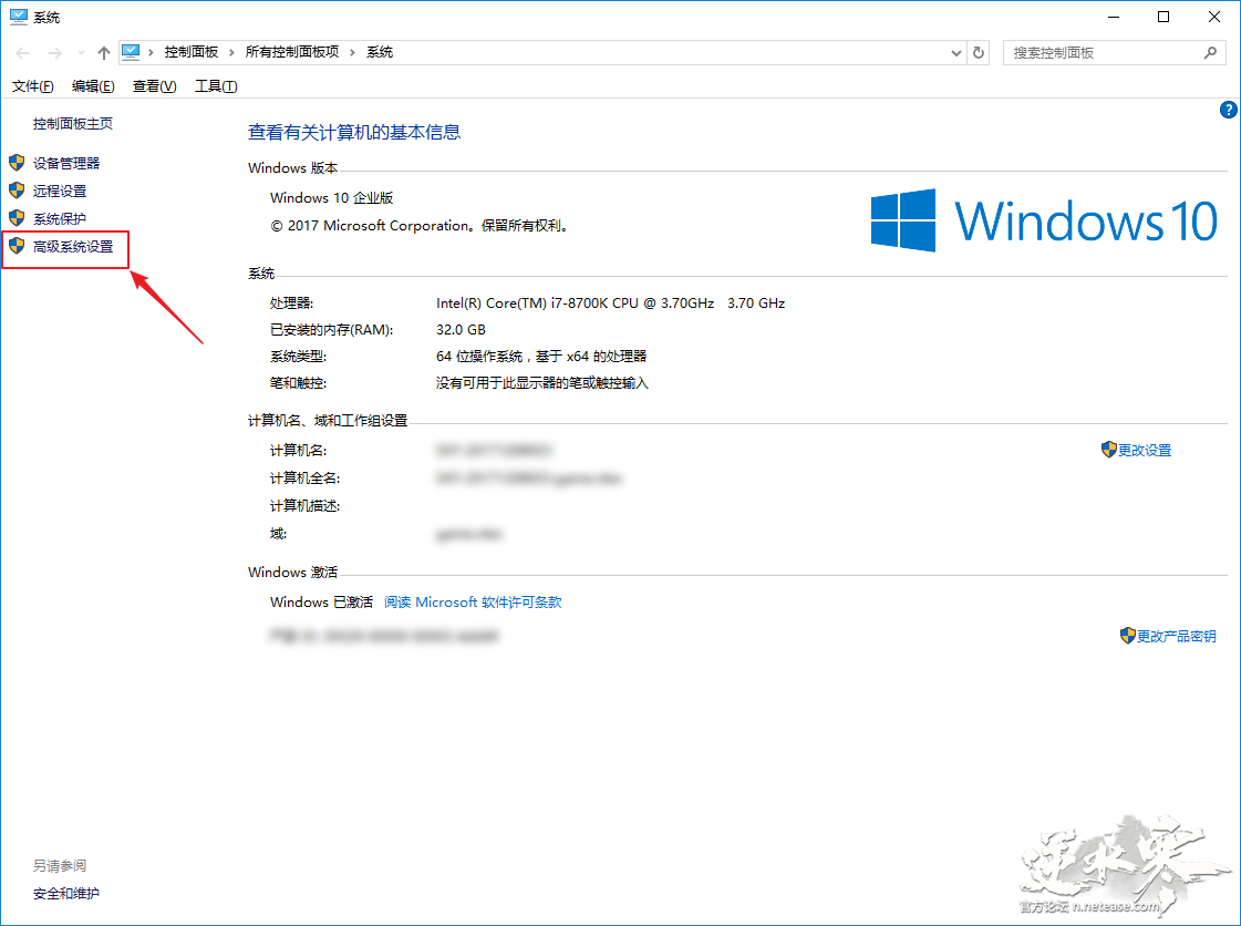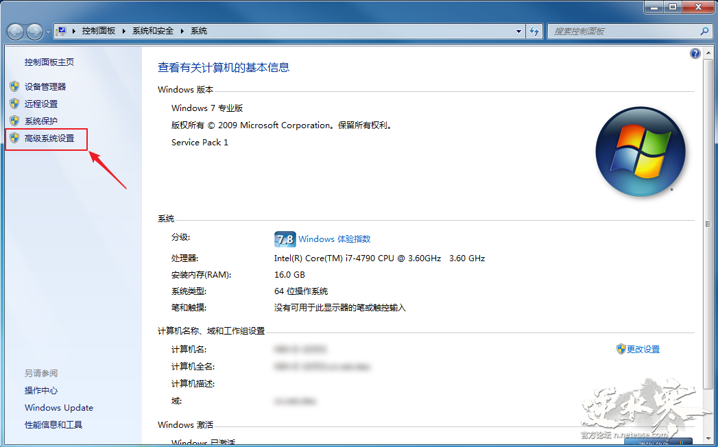 2、 在系统窗口中,在左边栏单击打开【高级系统设置】。