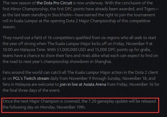 V社更新了DOTA2官方博客,很官方地宣布新赛季职业巡回赛系统的第一个Major即将开赛,以及赛制、奖金、DPC积分等我们已经都知道的消息。但是!在文章最后,他们公布了7.20的更新时间——2018年11月19日,周一,也就是吉隆坡Major决赛之后。这也是自T8结束以来DOTA2推出的首个大型更新。
