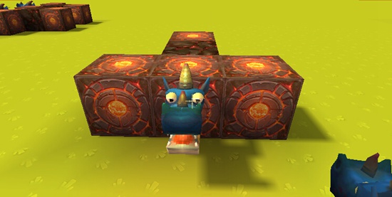 对着后面那个方块的上半部分放一个硫磺晶砂,这样放能保证硫磺晶砂的出风口对着前面;
