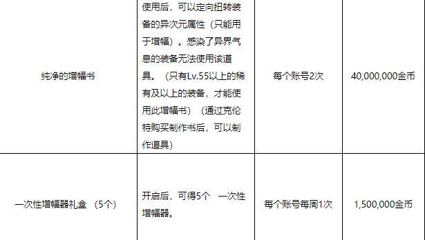 赛丽亚房间内的特惠专员NPC出售纯净的增幅书,账号限买2次,售价4000w金币,每周可以购买1次增幅器礼包(5个),售价150w金币。