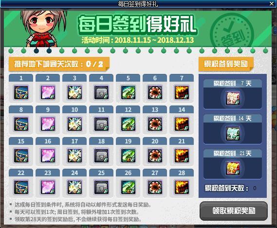 每天通关两次推荐地下城即可完成签到,除了每日签到的奖励之外,完成累积签到还可以获得85活动史诗兑换券、200个85史诗碎片、锻造炉、还有卢克传说装备。