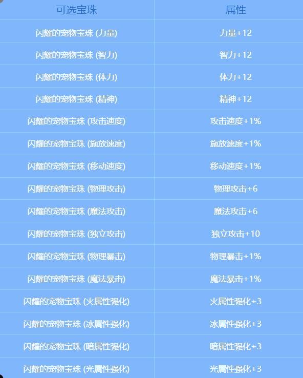 魔盒更新,加入宠物附魔宝珠,获取概率为0.5%,各宝珠属性如下: