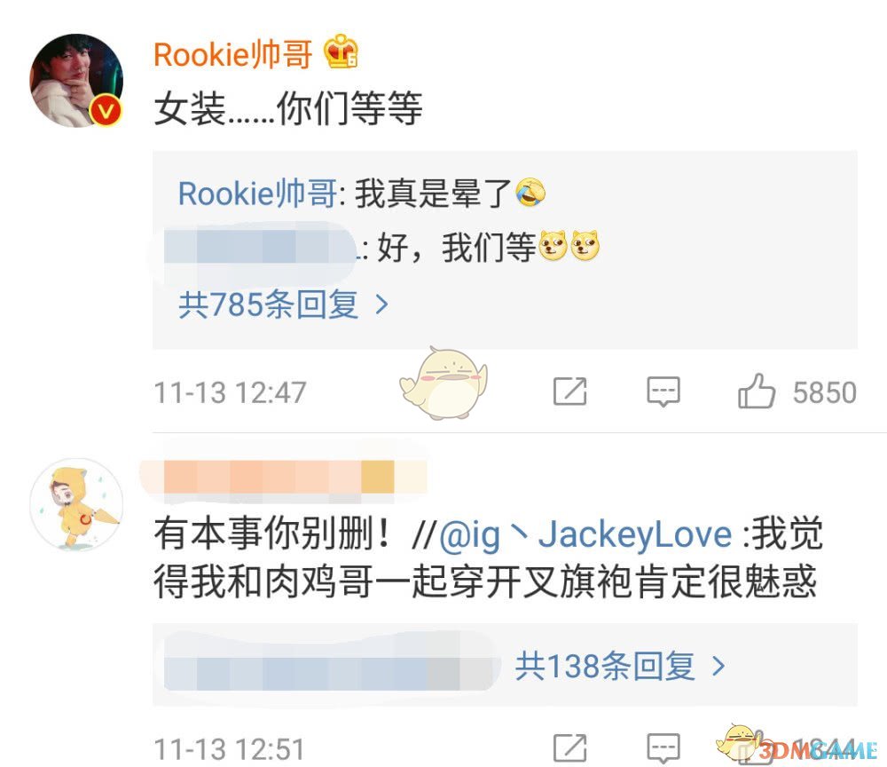 当然,Rookie也毫不忌讳的正面这个问题,让粉丝们再等等。而JackeyLove更是为女装添加筹码,表示和肉鸡(Rookie昵称)一起穿旗袍,被网友抓个正着...笔者也没想到,JackeyLove居然这么狠,年纪轻轻(即将18岁)狠起来连自己都坑...