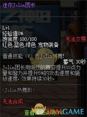 迷你Jolin团长宠物没有任何的属性加成,但是却有一个技能,在使用宠物普通技能的时候提升100点的力量和智力,还有5%的攻击速度和释放速度,看来策划是觉得直接写四维+10,三速加5%,可能看起来会让宠物等级变得很差,所以放在技能上,这样就会显得更高档一些?这一波操作挺骚气的呀。