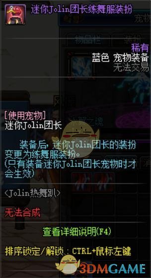 迷你Jolin团长练舞服装扮,大家其实应该猜出来是宠物装备了,但是这一个装备没有任何属性加成,唯独一个描述让这个宠物眼前一亮,那就是穿上这个宠物装备后,迷你Jolin团长宠物会变装,话说这个操作我回坑以来还没有发现遇到宠物使用装备可以变装的,这是特有的一只宠物了吧,不过属性有点差,要是做得好一些的属性,确实很有看点。