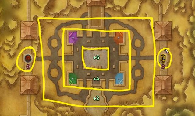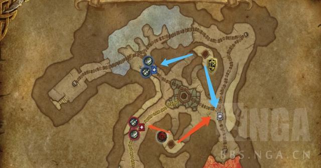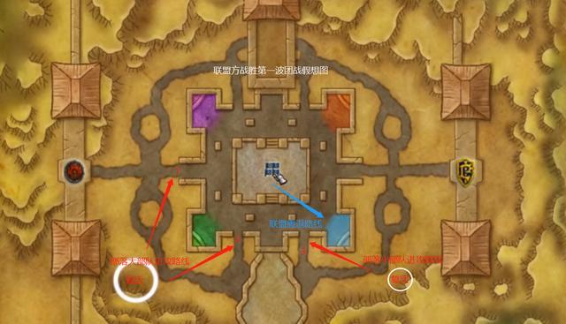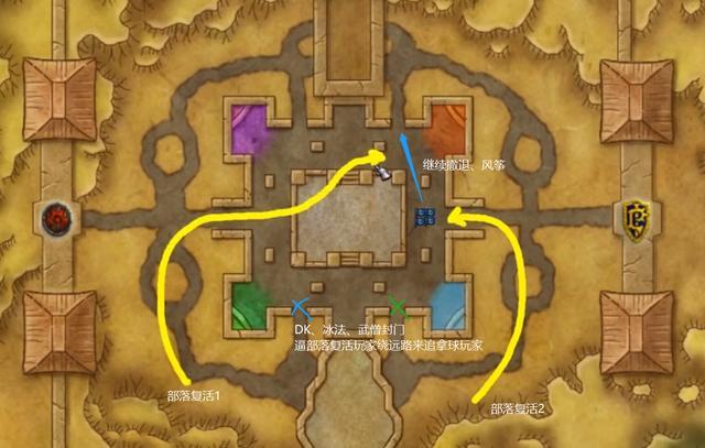 假设大部分的部落玩家都在左半场复活,小部分将在右半场复活,以下是一个进攻与撤退的路线