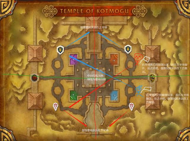 在地图左边死亡的部落玩家将在右下角复活 (近蓝色球) ,在地图右边死亡的部落玩家将在左下角复活 (近绿色球) 。