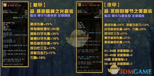 皮甲:想必现在很多玩家都觉得95A+皮甲有点凉,但它到底强不强确实要看使用它的职业。皮甲的均衡伤害(348.4%)其实仅次于板甲,并且对35-45级技能(369.3%)有着较高的单独提升;同时也有1级二觉等级的加成,是三套均衡提升防具中、对二觉提升(377.7%)最高的一套。
