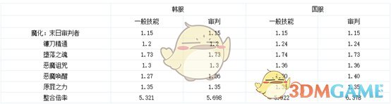 不计入白金徽章、王座以及时装上衣的等级提升,计入国服特色两级镰刀精通,恶魔诅咒,恶魔唤醒的等级提升,堕落之魂韩服取三绿皮73%技能攻击力,国服取四绿皮完美换装74%技能攻击力。一觉被动恶魔唤醒对一觉终结技审判有着独立的加成数据,因此将审判和一般技能分开进行计算。