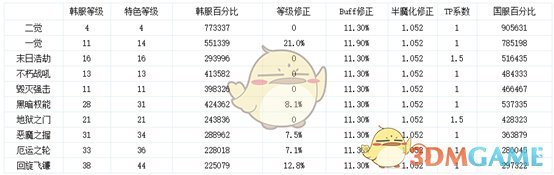 然后,由于改版后目前的国服特色半魔化等级惨遭阉割,变为固定1.15,以国服裸装满特色7级半魔化21%爆伤为基准,引入半魔化修正系数1.21/1.15=1.052;