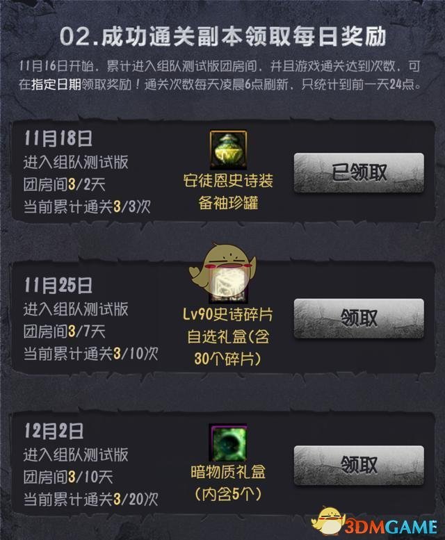 通过助手预约组队打团,这样可以更快的集合成员,这个功能其实很赞。而且为了让这个功能达到宣传,附上了一个体验活动,活动每天都送材料,包括卢克团本门票、浓缩的魔能石、异面奖章、荣耀之德洛斯勋章等,最主要的是送了只要打了三次团,就能领到一个安徒恩史诗罐子,这个罐子和我们用红豆换的罐子中一样,并且还是账号绑定的。今天是制定领取史诗罐子的日期,错过了就没有了。