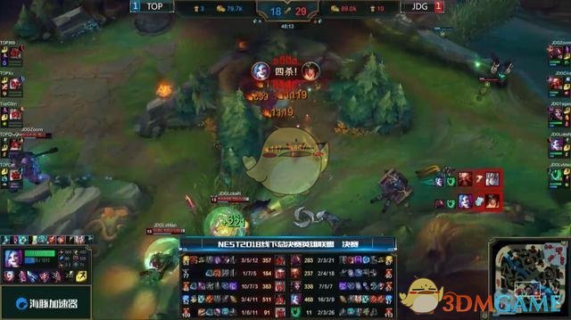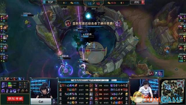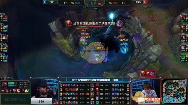 [45:48] 双方站位远古龙坑,妖姬在偷中路水晶,塞恩大招先手开团留人,青钢影再次被击杀,金克斯被动加速收获四杀,JDG一举推进推掉水晶结束比赛,恭喜JDG拿下NEST冠军。