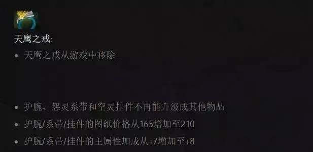 还有“点金手”的攻击速度增加了10点,这也让很多玩家可以心安理得的憋点金了,当然最重要的一点是,上个版本大热的物品天鹰戒在这个版本里被移除了。