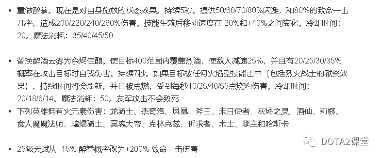 酒仙又加强了,重做了醉拳,现在可以主动使用在5秒内高达80%的闪避+暴击,简直是肉搏之王。前期学一级就可以抓着对面英雄锤,一个踩地板,追上去几棍子就敲死了。2技能也重做了,一个范围性的debuff技能,大招的火熊猫能刷新这个灼烧时间。25级的天赋更有意思了,+200%暴击,加上原先的260%,80%概率4.6倍的暴击,性价比远超幻刺大招了。笔者测试了一下,后期稍微出点物理输出装的酒仙,5秒内刀刀一千多伤害,敲对面脆皮辅助可能只需要一下。期待1号位物理菜刀流大哥酒仙的崛起!