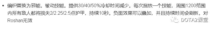 重做了祸乱之源的1技能,之前是减攻击力,现在变成了给敌人增加一个debuff,增加敌人的负状态抗性,还降低大量攻速。例如这个技能可以增加敌人被羊时的持续时间,可以增加自己大招的控制时间。配合队友的一些控制、减速、沉默技能,相当的恶心。更加恶心的是降低攻速,前中期对面输出英雄没有bkb,冲上来被减100攻速,一下都a不出,一头包。