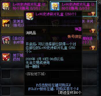 在商店中最重要的奖励是史诗碎片,85级和90级史诗碎片各250个,一共就是500个史诗碎片。另外一个周可以兑换一次深渊票,账号可兑换两张卡片,紫色品质百分百升级卡片,跟国庆活动推出的巴斯泰托一样,另外还可以兑换地下城相册2个。
