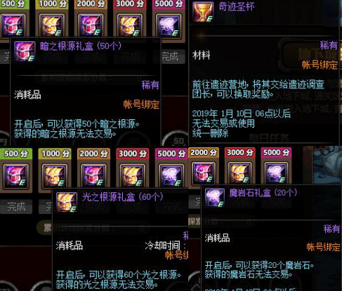 活动奖励道具以魔岩石为主,分为每日任务和累积任务,每日任务可以获得加速药剂、奇迹圣杯材料和深渊票,每天30张深渊票。累计任务的奖励就比较丰厚了,可以获得总计80个暗之根源、100个光之根源以及20个魔岩石,将暗之根源兑换成魔岩石,总计是33个魔岩石。