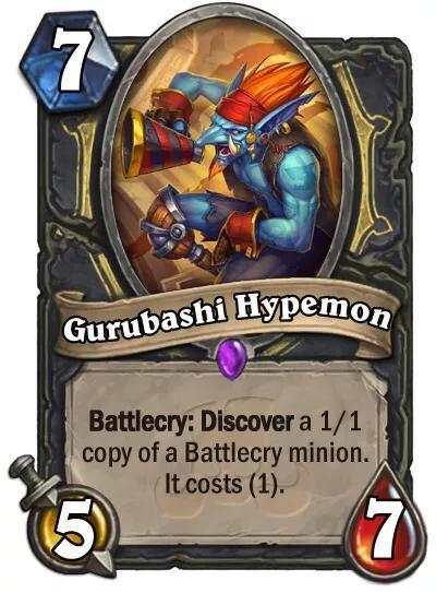 团伙劫掠,盗贼蓝卡法术。墓园恐魔,牧师蓝卡随从。狂野兽王,中立紫卡随从。猛虎之灵,圣骑士蓝卡随从。格罗尔,鲨鱼之神,盗贼橙卡随从。夺灵者哈卡,中立橙卡随从。赞达拉武士,圣骑士蓝卡随从。指挥官沃恩,战士橙卡随从。火树巫医,中立蓝卡随从。古拉巴什巨魔宣传员,盗贼紫卡随从。