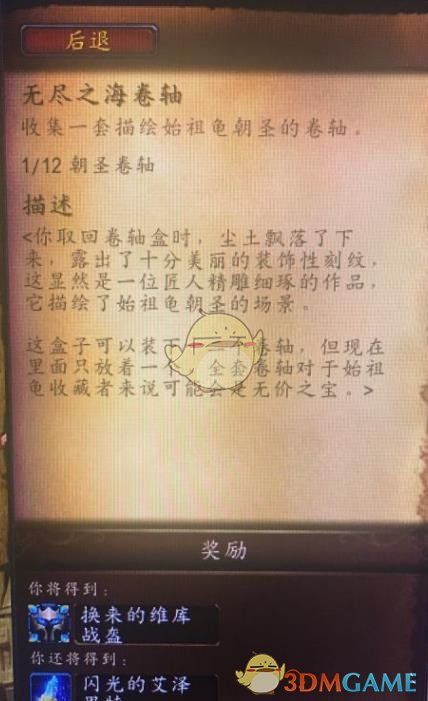 但是这个任务是长线任务奖励就高普装15点,拿到了就快进入英雄本阶段了。好像宝箱开的有个叫海龟卷轴,再右击使用就会变成朝圣的了,我是整理包包时候发现的。