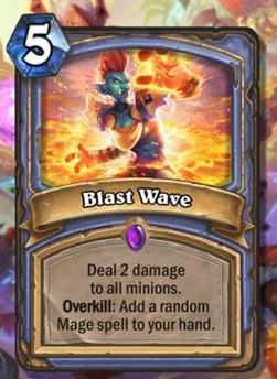 爆炸冲击波。法师紫卡法术:5费。对所有随从造成2点伤害,超杀:随机将一张法师职业的法术牌置入手中。这张牌也是好评,对奇数法的意义更大一些,AOE+补充手牌,奇数法也可以有陨石暴风雪炎爆了!