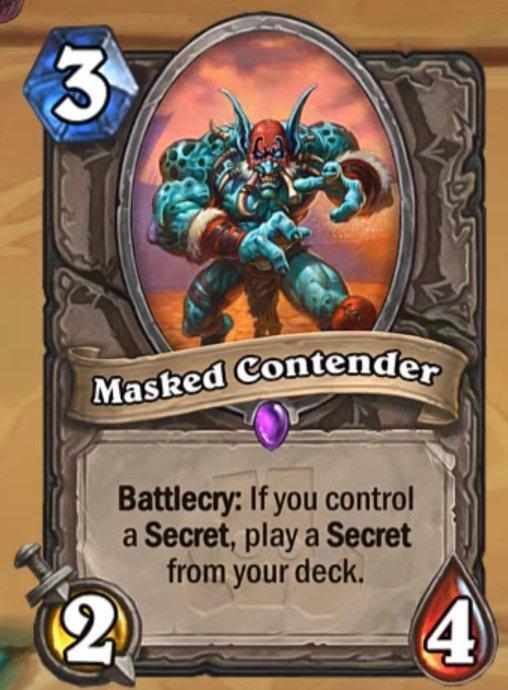 蒙面劫掠者。中立紫卡随从:3费2/4。战吼:如果你控制一个奥秘,将一个奥秘从牌库中置入战场。感觉像是奥秘系职业的补强,可能奥秘法或者奥秘猎会加这张卡,但是新版本环境还不能确定。