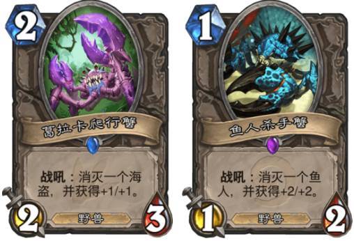 鱼人杀手蟹和葛拉卡爬行蟹,在鱼人流和海盗流盛行的时期,人们总会在构筑中,把其中的一张或者满编至卡组构筑中,最主要的想法那就是在低费回合能够起到对抗这些在低费回合就能疯狂铺场的卡组。在加基森、卡拉赞以及安戈洛版本时期,鱼人流和海盗流都是这些版本中比较强势的卡组,这两只螃蟹也获得了不菲的出场率。但在后期这两个流派式微后,这两只螃蟹也就被“鸟尽弓藏”地暂时放弃在卡组收藏夹中了。听说新版本海盗会卷土重来?葛拉卡爬行者表示机会又来了!