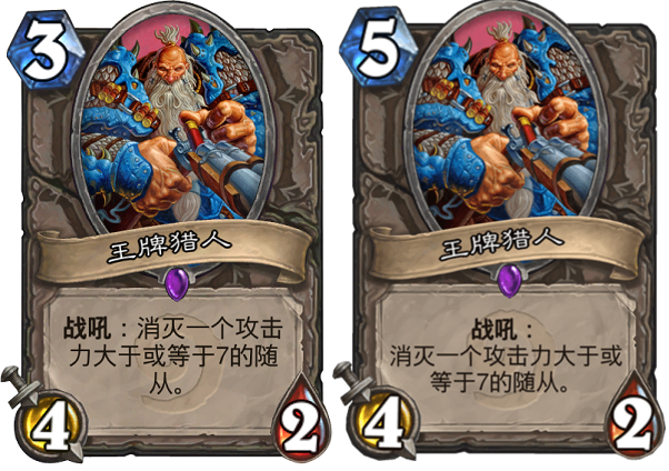 在炉石传说早期,大螺丝、砰砰博士和各种“巨人”们都是天梯的常客。为了有效对抗他们,王牌猎人这张中立紫卡便经常被玩家们编入构筑,能够在消灭对面这些“大哥”的同时,己方也能站住42的一个场面,实乃一些缺少优质单解手段卡组的最爱。但是,因为这张卡牌的泛用性,让玩家们话费高额费用下的“大哥”容易被瞬杀,于是为了方面后期推出更多的“大哥”牌,设计师便把这张“讨厌”的克制者王牌猎人削弱到5费,除了少数“挨打战”会带上5费的它以外,其他卡组也就因为费用太高的原因。都放弃了这张曾经崩掉无数大哥德优质卡牌。