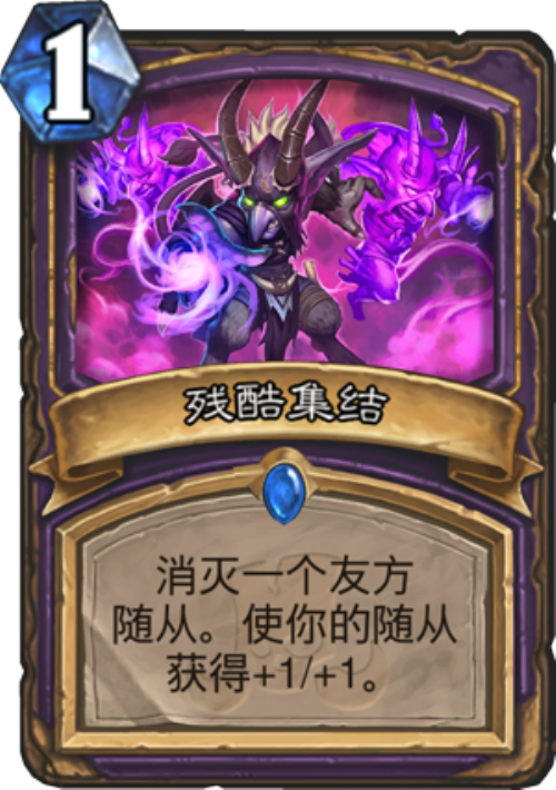 术士稀有法术。1费,摧毁友方一个随从,使你的随从获得+1/1,意思应该是说:把场上某随从爆掉,变成类似德鲁伊野性之力的全部随从+1/1,这卡对于术士来说很强, 无论是对于快攻术士还是控制术士,快攻的作用自然不言而喻。