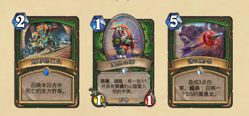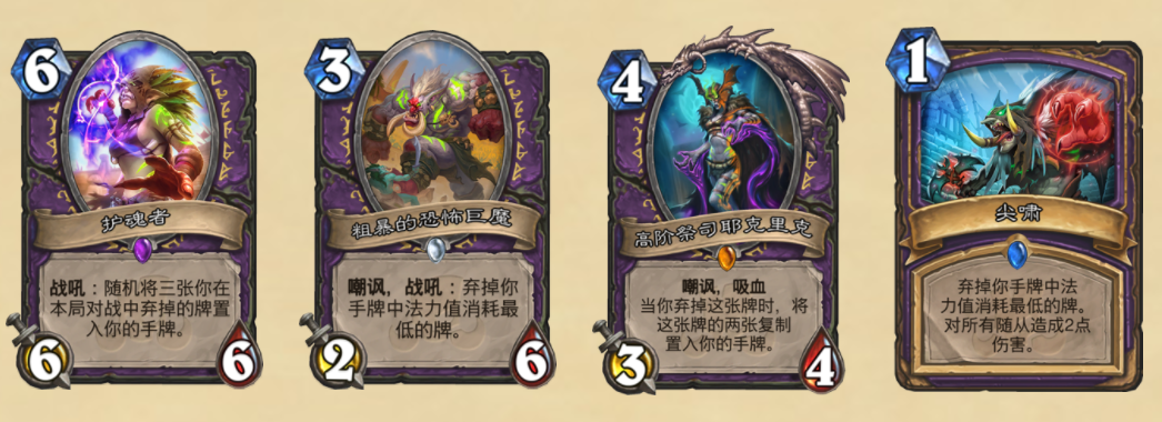 在目前的版本中,亡语猎的玩法一直都是版本的主流。魔暴龙蛋,搭配二王子,冬灵跟一系列带亡语效果的随从,在前期召唤出魔暴龙战斗,中期开始利用暴龙王和魔暴龙打出斩杀。而在新版本中,设计师似乎为这种玩法加入了更多的储备。