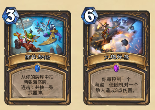 最初期的海盗玩法,各种海盗随从搭配火炮,前期站场中期斩杀。但是在较古老的版本之中,这套玩法并不能成为版本的主流。在新版本中,也许是设计师看到了海盗贼的相对弱势,所以选择为他加入两张全新的卡牌。从目前看,这两张卡牌能有效帮助海盗贼迅速过牌跟在中期打出伤害,不过具体的实战效果依然要等待玩家们的开发。
