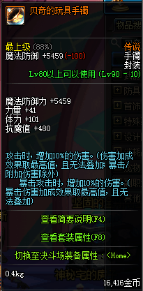 90的传说手镯,增加10%的黄字和爆伤,对于没有黄字和爆伤的玩家这个还是很不错的选择。