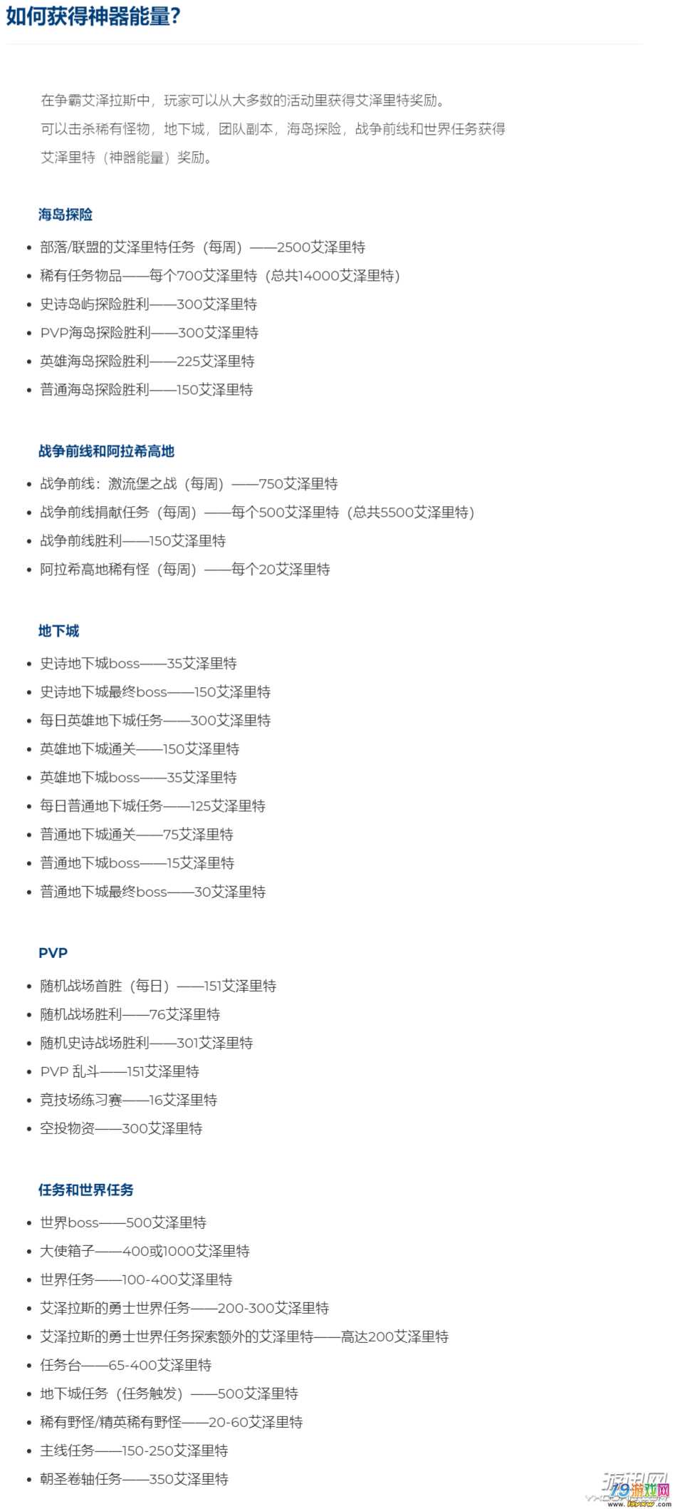《魔兽世界》8.0版本“争霸艾泽拉斯”中玩家将会获取到新的神器“艾泽拉斯之心”,需要获取能量来提升等级,下面就为大家带来8.0神器能量获取途径汇总。