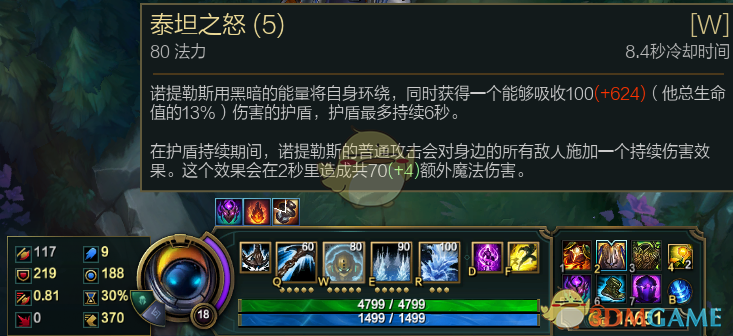 光说数据大家可能比较抽象,这里我们就用神装泰坦来举例子吧,在正常的神装状态下,泰坦的血量是4799,泰坦的基础血量是2038,泰坦的额外生命值就是2761,在这套装备下,W技能的护盾值是724,也就是说,在满级时,泰坦在开启了W技能之后,下一次普攻可以造成21+(8.5%*724)+(1.5%*2761),也就是21+62+41,这一下平A可以造成124点的伤害,乍一看好像很少,但实际上,泰坦几乎每一次开启W技能都可以造成伤害,因为这个符文是没有冷却的。