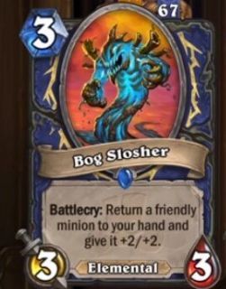 泽泥泞。萨满稀有随从,3费3/3,元素。战吼:使一个友方随从回到你的手牌,并使其+2/+2。是一张战吼萨的强度补全卡,这样的话就不用担心回手橙卡一直不来,手上一直卡着一张沙德沃克的尴尬场景了。